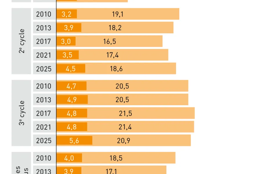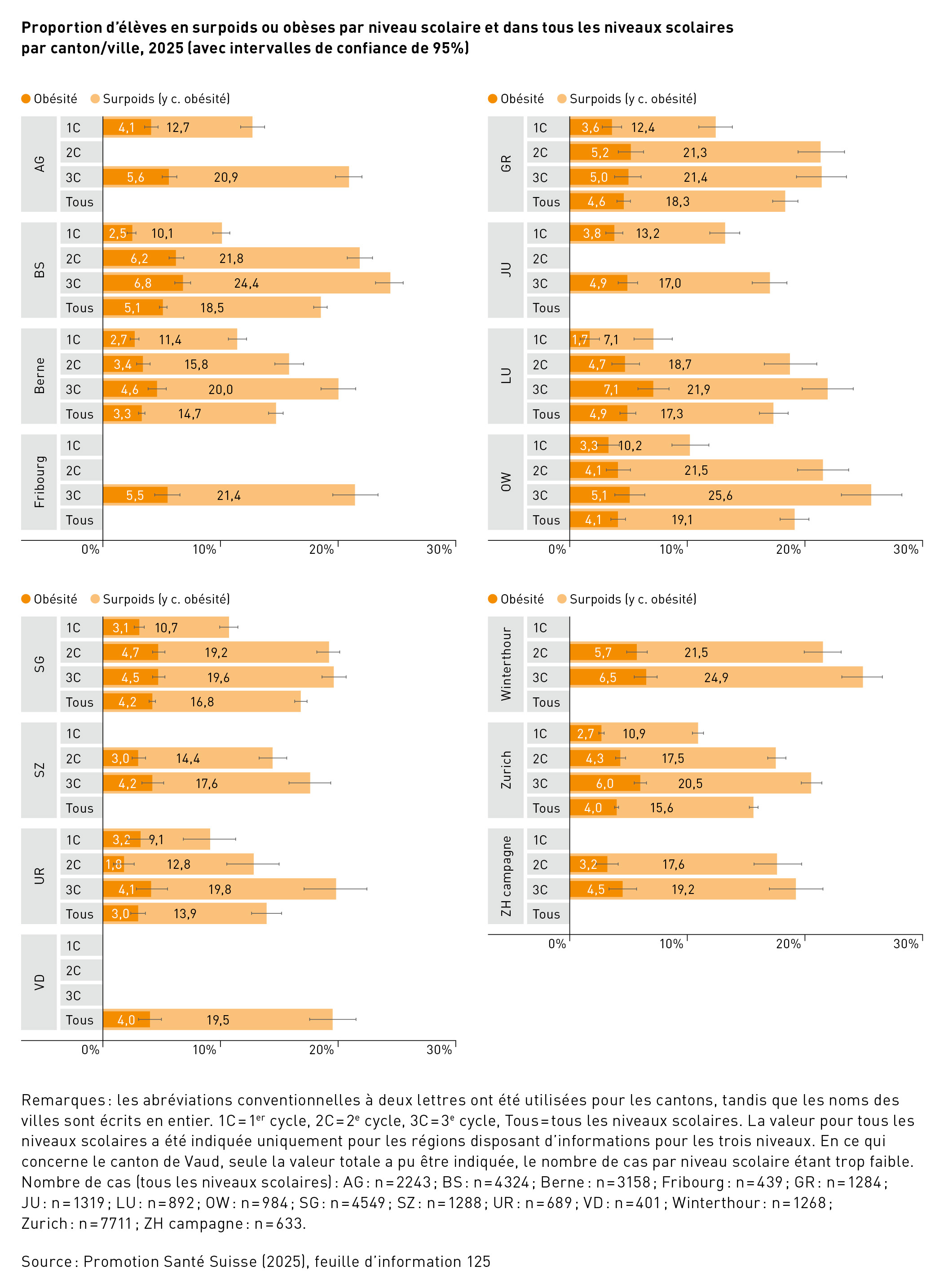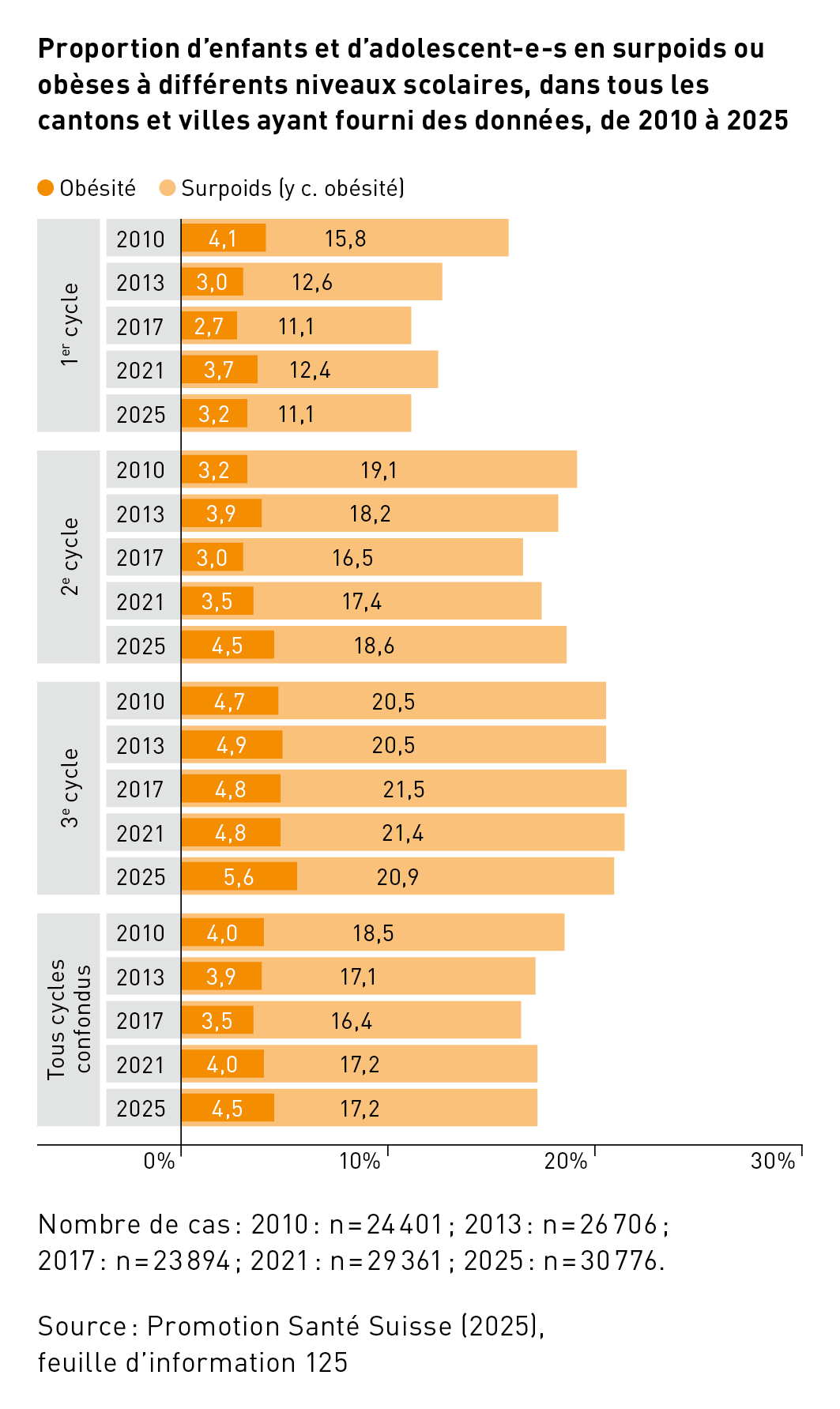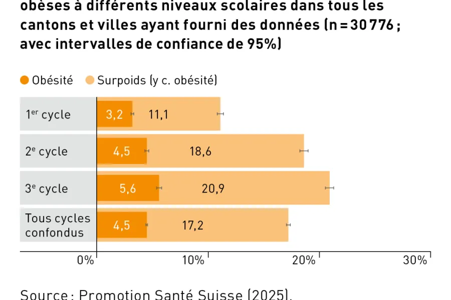 Nell’ambito dell’ultimo monitoraggio sono stati raccolti e analizzati i dati di oltre 30'000 allieve e allievi di undici cantoni e quattro città. Nel primo ciclo (scuola dell’infanzia, prima e seconda elementare) si osserva un calo evidente del sovrappeso, con una riduzione dal 15,8% nel 2010 all’11,1% nel 2025. Nel secondo ciclo, la quota di bambine e bambini in sovrappeso è scesa dal 19,1% nel 2010 al 16,5% nel 2017, per poi risalire al 18,6% nell’ultimo rilevamento, mentre nel terzo ciclo il sovrappeso è stabile dal 2010 (20,5%; 2025: 20,9%), con alcuni primi segnali di distensione. I valori indicati includono anche le bambine e i bambini in forte sovrappeso (obesi).