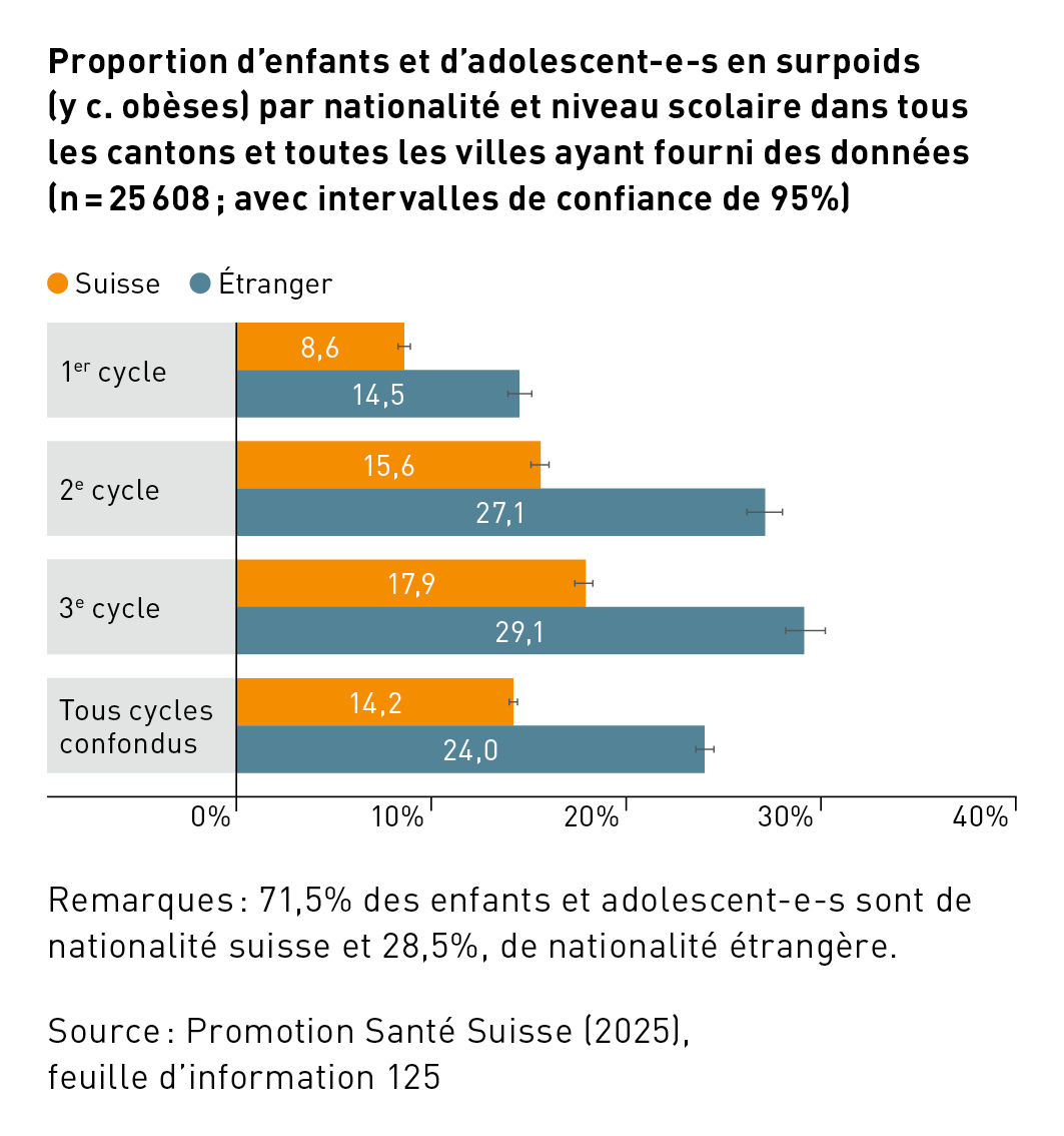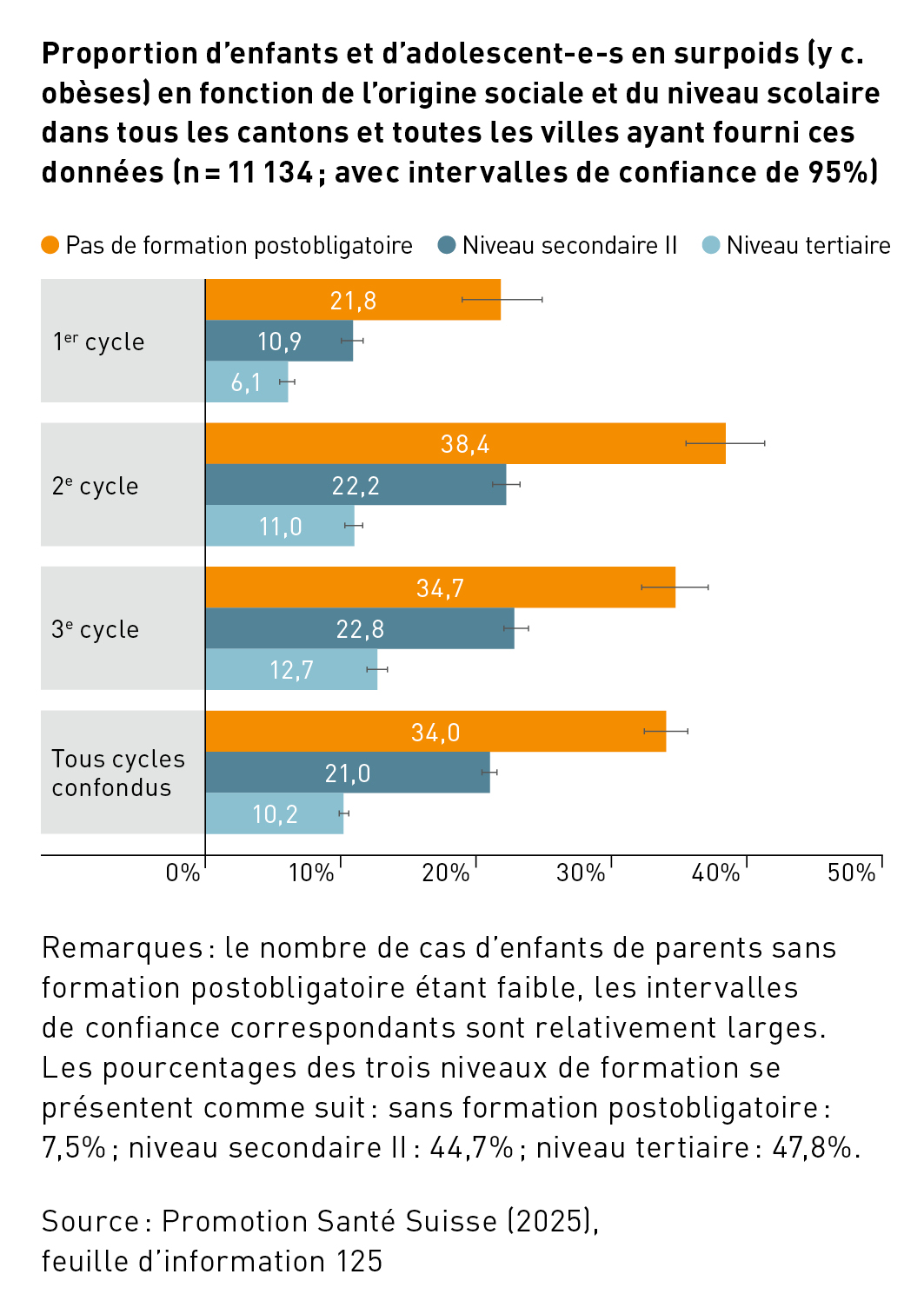 L’analisi dei dati conferma la presenza di una forte correlazione tra il peso corporeo e il contesto in cui vivono i bambini e le loro famiglie: il sovrappeso si manifesta con una frequenza di tre volte maggiore nelle bambine e nei bambini i cui genitori non hanno completato una formazione post-obbligatoria, rispetto alle situazioni familiari nelle quali i genitori dispongono di un diploma terziario. Inoltre, si osserva una maggiore prevalenza del sovrappeso tra le allieve e gli allievi senza passaporto svizzero (24%) rispetto a coloro che hanno la cittadinanza elvetica (14,2%).