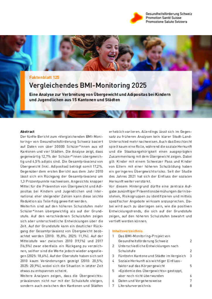 I risultati indicano chiaramente che servono ulteriori misure mirate, in particolare per le bambine e i bambini che vivono in situazioni di svantaggio socioeconomico. Il problema non consiste tanto nella mancanza di offerte quanto nella loro portata. Occorre individuare ed eliminare in modo sistematico e mirato eventuali ostacoli che impediscono alle persone di accedere alle offerte disponibili. È altrettanto importante riuscire a trasferire i risultati positivi ottenuti nel primo ciclo ai livelli scolastici superiori. In questo contesto è determinante intervenire precocemente con misure di promozione della salute e prevenzione. Promozione Salute Svizzera punta su misure che mettono in rete le scuole, i comuni e i cantoni. Poiché il sovrappeso è ampiamente riconducibile a fattori di natura strutturale, oltre alle misure di politica sanitaria serve il sostegno della politica dell’istruzione e della socialità, al fine di garantire le pari opportunità nel campo della salute.