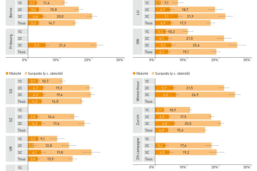 I risultati mostrano notevoli differenze tra le diverse regioni prese in esame: nel primo ciclo la quota di bambine e bambini in sovrappeso può variare di circa sei punti percentuali da un cantone all’altro, mentre nel terzo ciclo si registrano differenze regionali superiori agli otto punti percentuali. Nell’ambito delle misurazioni precedenti erano emerse differenze evidenti tra città e campagna, che nel frattempo si sono ridotte – probabilmente a causa dell’espansione e della fusione degli agglomerati.