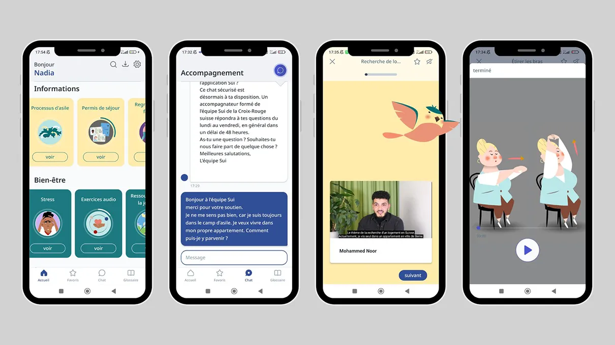 L'app Sui SRK della Croce Rossa Svizzera (CRS), disponibile in diverse lingue, è stata sviluppata da un gruppo interdisciplinare con la partecipazione attiva di persone rifugiate, con l'obiettivo di migliorare in modo duraturo il loro benessere. Oltre a fornire un accesso digitale a bassa soglia a informazioni utili per la vita quotidiana e a offerte di sostegno locali (approccio «stepped care»), l'app propone diversi esercizi volti a favorire il benessere mentale delle persone rifugiate nonché un servizio di sostegno psicosociale da parte di pari appositamente formati che parlano la stessa lingua delle persone rifugiate.
