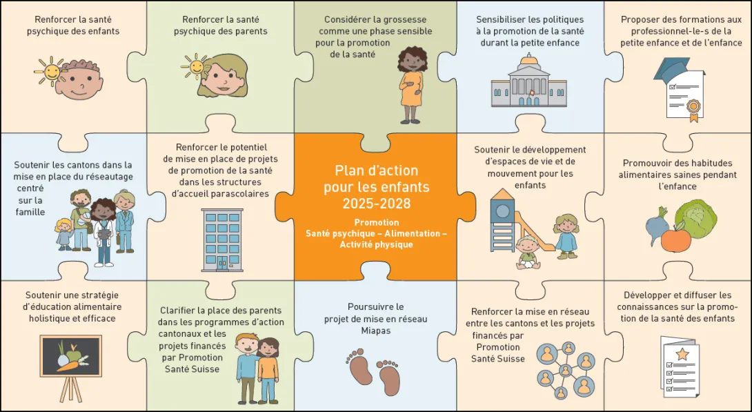 Promozione Salute Svizzera si impegna a favore della promozione della salute durante l’infanzia (0-12 anni). Il suo impegno copre le diverse fasi dell’infanzia: gravidanza, età prescolastica (prima infanzia), età scolastica (primo e secondo ciclo).